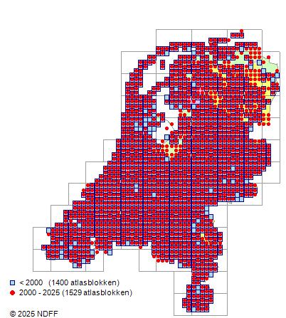 Het aantal atlasblokken (5x5 km) waarin de soort is gemeld binnen een periode van vijf jaar (vanaf 1980) of twintig jaar. Niet gecorrigeerd voor waarnemersinspanning en het aantal doorgegeven waarnemingen kan sterk variƫren per periode, dus een trend in verspreiding kan hier niet direct uit worden afgelezen. Het opgegeven jaartal is het eerste jaar van de periode. Bron: gevalideerde waarnemingen uit de NDFF.