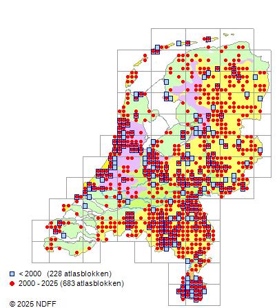 Het aantal atlasblokken (5x5 km) waarin de soort is gemeld binnen een periode van vijf jaar (vanaf 1980) of twintig jaar. Niet gecorrigeerd voor waarnemersinspanning en het aantal doorgegeven waarnemingen kan sterk variƫren per periode, dus een trend in verspreiding kan hier niet direct uit worden afgelezen. Het opgegeven jaartal is het eerste jaar van de periode. Bron: gevalideerde waarnemingen uit de NDFF.