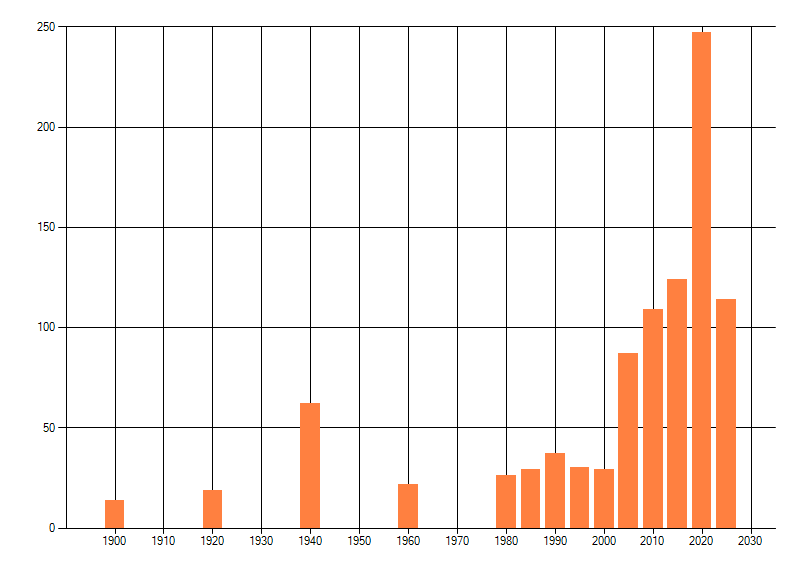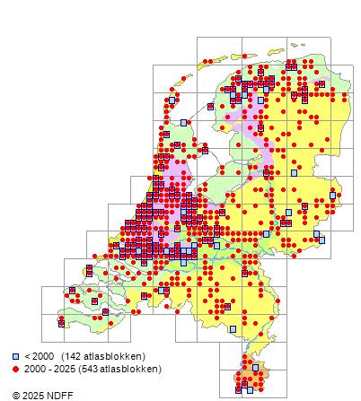 Het aantal atlasblokken (5x5 km) waarin de soort is gemeld binnen een periode van vijf jaar (vanaf 1980) of twintig jaar. Niet gecorrigeerd voor waarnemersinspanning en het aantal doorgegeven waarnemingen kan sterk variƫren per periode, dus een trend in verspreiding kan hier niet direct uit worden afgelezen. Het opgegeven jaartal is het eerste jaar van de periode. Bron: gevalideerde waarnemingen uit de NDFF.