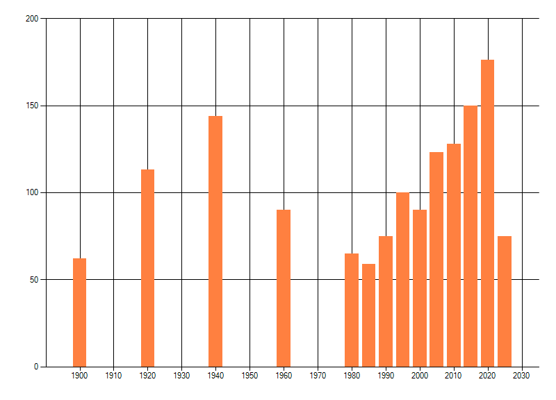 Het aantal atlasblokken (5x5 km) waarin de soort is gemeld binnen een periode van vijf jaar (vanaf 1980) of twintig jaar. Niet gecorrigeerd voor waarnemersinspanning en het aantal doorgegeven waarnemingen kan sterk variƫren per periode, dus een trend in verspreiding kan hier niet direct uit worden afgelezen. Het opgegeven jaartal is het eerste jaar van de periode. Bron: gevalideerde waarnemingen uit de NDFF.