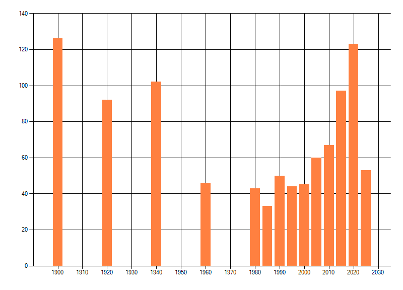 Het aantal atlasblokken (5x5 km) waarin de soort is gemeld binnen een periode van vijf jaar (vanaf 1980) of twintig jaar. Niet gecorrigeerd voor waarnemersinspanning en het aantal doorgegeven waarnemingen kan sterk variëren per periode, dus een trend in verspreiding kan hier niet direct uit worden afgelezen. Het opgegeven jaartal is het eerste jaar van de periode. Bron: gevalideerde waarnemingen uit de NDFF.
