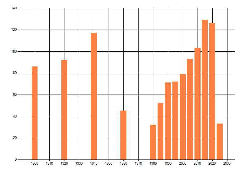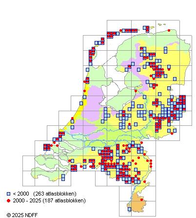 Het aantal atlasblokken (5x5 km) waarin de soort is gemeld binnen een periode van vijf jaar (vanaf 1980) of twintig jaar. Niet gecorrigeerd voor waarnemersinspanning en het aantal doorgegeven waarnemingen kan sterk variƫren per periode, dus een trend in verspreiding kan hier niet direct uit worden afgelezen. Het opgegeven jaartal is het eerste jaar van de periode. Bron: gevalideerde waarnemingen uit de NDFF.