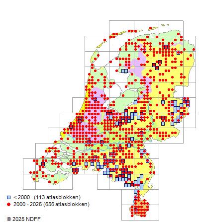 Het aantal atlasblokken (5x5 km) waarin de soort is gemeld binnen een periode van vijf jaar (vanaf 1980) of twintig jaar. Niet gecorrigeerd voor waarnemersinspanning en het aantal doorgegeven waarnemingen kan sterk variëren per periode, dus een trend in verspreiding kan hier niet direct uit worden afgelezen. Het opgegeven jaartal is het eerste jaar van de periode. Bron: gevalideerde waarnemingen uit de NDFF.