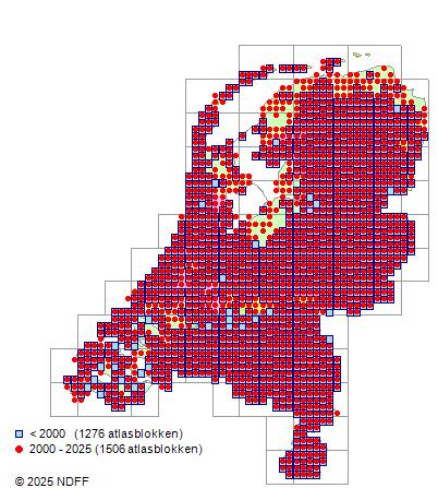 Het aantal atlasblokken (5x5 km) waarin de soort is gemeld binnen een periode van vijf jaar (vanaf 1980) of twintig jaar. Niet gecorrigeerd voor waarnemersinspanning en het aantal doorgegeven waarnemingen kan sterk variëren per periode, dus een trend in verspreiding kan hier niet direct uit worden afgelezen. Het opgegeven jaartal is het eerste jaar van de periode. Bron: gevalideerde waarnemingen uit de NDFF.