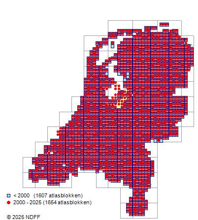 Het aantal atlasblokken (5x5 km) waarin de soort is gemeld binnen een periode van vijf jaar (vanaf 1980) of twintig jaar. Niet gecorrigeerd voor waarnemersinspanning en het aantal doorgegeven waarnemingen kan sterk variëren per periode, dus een trend in verspreiding kan hier niet direct uit worden afgelezen. Het opgegeven jaartal is het eerste jaar van de periode. Bron: gevalideerde waarnemingen uit de NDFF.