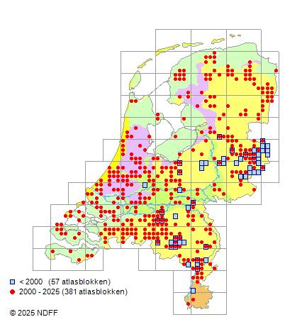 Het aantal atlasblokken (5x5 km) waarin de soort is gemeld binnen een periode van vijf jaar (vanaf 1980) of twintig jaar. Niet gecorrigeerd voor waarnemersinspanning en het aantal doorgegeven waarnemingen kan sterk variëren per periode, dus een trend in verspreiding kan hier niet direct uit worden afgelezen. Het opgegeven jaartal is het eerste jaar van de periode. Bron: gevalideerde waarnemingen uit de NDFF.