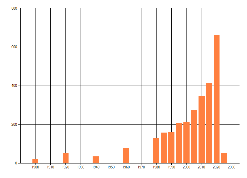 Het aantal atlasblokken (5x5 km) waarin de soort is gemeld binnen een periode van vijf jaar (vanaf 1980) of twintig jaar. Niet gecorrigeerd voor waarnemersinspanning en het aantal doorgegeven waarnemingen kan sterk variƫren per periode, dus een trend in verspreiding kan hier niet direct uit worden afgelezen. Het opgegeven jaartal is het eerste jaar van de periode. Bron: gevalideerde waarnemingen uit de NDFF.