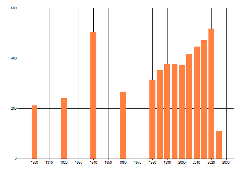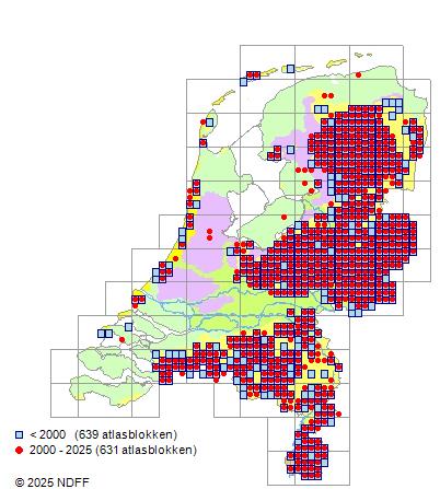 Het aantal atlasblokken (5x5 km) waarin de soort is gemeld binnen een periode van vijf jaar (vanaf 1980) of twintig jaar. Niet gecorrigeerd voor waarnemersinspanning en het aantal doorgegeven waarnemingen kan sterk variëren per periode, dus een trend in verspreiding kan hier niet direct uit worden afgelezen. Het opgegeven jaartal is het eerste jaar van de periode. Bron: gevalideerde waarnemingen uit de NDFF.