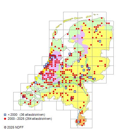 Het aantal atlasblokken (5x5 km) waarin de soort is gemeld binnen een periode van vijf jaar (vanaf 1980) of twintig jaar. Niet gecorrigeerd voor waarnemersinspanning en het aantal doorgegeven waarnemingen kan sterk variëren per periode, dus een trend in verspreiding kan hier niet direct uit worden afgelezen. Het opgegeven jaartal is het eerste jaar van de periode. Bron: gevalideerde waarnemingen uit de NDFF.