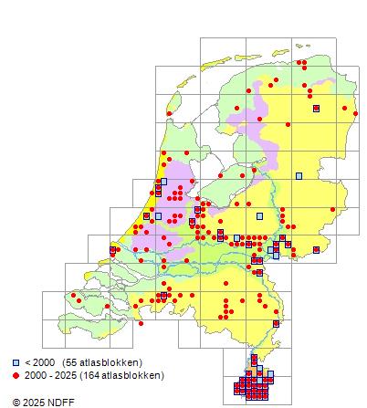 Het aantal atlasblokken (5x5 km) waarin de soort is gemeld binnen een periode van vijf jaar (vanaf 1980) of twintig jaar. Niet gecorrigeerd voor waarnemersinspanning en het aantal doorgegeven waarnemingen kan sterk variëren per periode, dus een trend in verspreiding kan hier niet direct uit worden afgelezen. Het opgegeven jaartal is het eerste jaar van de periode. Bron: gevalideerde waarnemingen uit de NDFF.