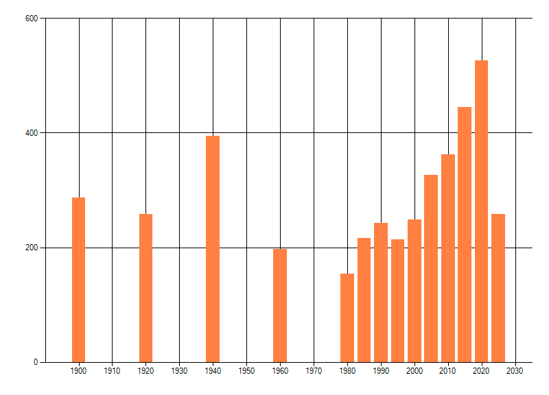 Het aantal atlasblokken (5x5 km) waarin de soort is gemeld binnen een periode van vijf jaar (vanaf 1980) of twintig jaar. Niet gecorrigeerd voor waarnemersinspanning en het aantal doorgegeven waarnemingen kan sterk variëren per periode, dus een trend in verspreiding kan hier niet direct uit worden afgelezen. Het opgegeven jaartal is het eerste jaar van de periode. Bron: gevalideerde waarnemingen uit de NDFF.