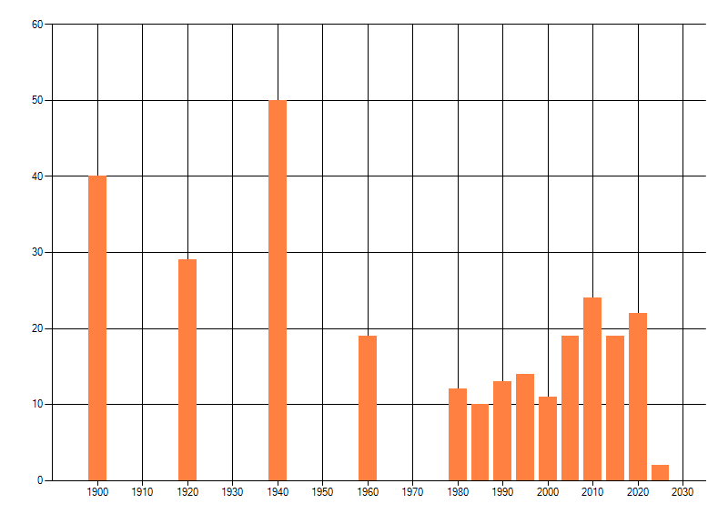 Het aantal atlasblokken (5x5 km) waarin de soort is gemeld binnen een periode van vijf jaar (vanaf 1980) of twintig jaar. Niet gecorrigeerd voor waarnemersinspanning en het aantal doorgegeven waarnemingen kan sterk variëren per periode, dus een trend in verspreiding kan hier niet direct uit worden afgelezen. Het opgegeven jaartal is het eerste jaar van de periode. Bron: gevalideerde waarnemingen uit de NDFF.