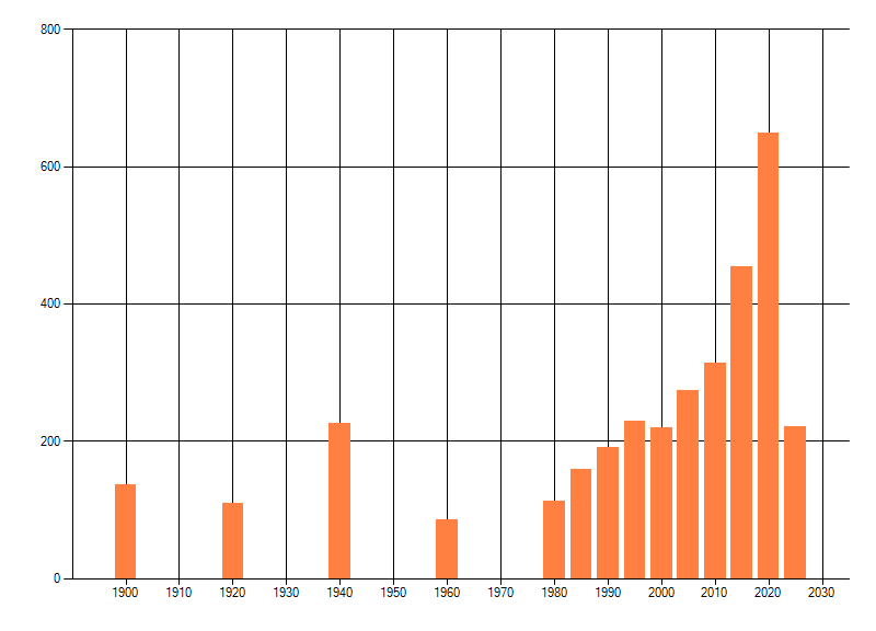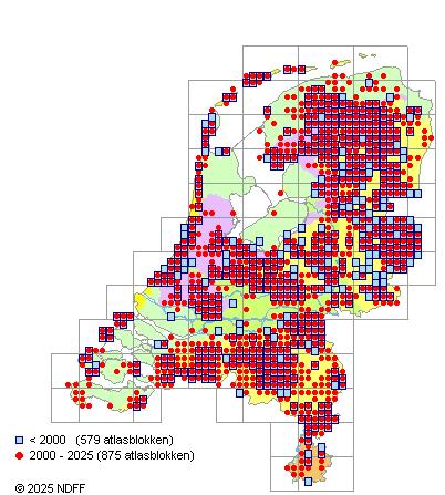 Het aantal atlasblokken (5x5 km) waarin de soort is gemeld binnen een periode van vijf jaar (vanaf 1980) of twintig jaar. Niet gecorrigeerd voor waarnemersinspanning en het aantal doorgegeven waarnemingen kan sterk variëren per periode, dus een trend in verspreiding kan hier niet direct uit worden afgelezen. Het opgegeven jaartal is het eerste jaar van de periode. Bron: gevalideerde waarnemingen uit de NDFF.