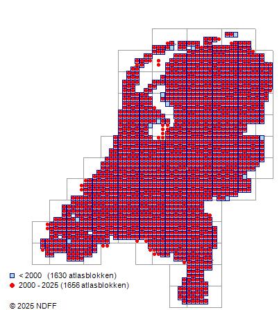 Het aantal atlasblokken (5x5 km) waarin de soort is gemeld binnen een periode van vijf jaar (vanaf 1980) of twintig jaar. Niet gecorrigeerd voor waarnemersinspanning en het aantal doorgegeven waarnemingen kan sterk variëren per periode, dus een trend in verspreiding kan hier niet direct uit worden afgelezen. Het opgegeven jaartal is het eerste jaar van de periode. Bron: gevalideerde waarnemingen uit de NDFF.