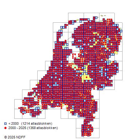 Het aantal atlasblokken (5x5 km) waarin de soort is gemeld binnen een periode van vijf jaar (vanaf 1980) of twintig jaar. Niet gecorrigeerd voor waarnemersinspanning en het aantal doorgegeven waarnemingen kan sterk variëren per periode, dus een trend in verspreiding kan hier niet direct uit worden afgelezen. Het opgegeven jaartal is het eerste jaar van de periode. Bron: gevalideerde waarnemingen uit de NDFF.