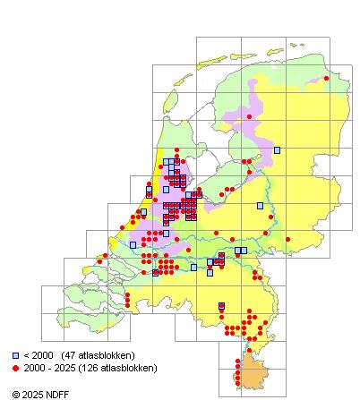 Het aantal atlasblokken (5x5 km) waarin de soort is gemeld binnen een periode van vijf jaar (vanaf 1980) of twintig jaar. Niet gecorrigeerd voor waarnemersinspanning en het aantal doorgegeven waarnemingen kan sterk variëren per periode, dus een trend in verspreiding kan hier niet direct uit worden afgelezen. Het opgegeven jaartal is het eerste jaar van de periode. Bron: gevalideerde waarnemingen uit de NDFF.
