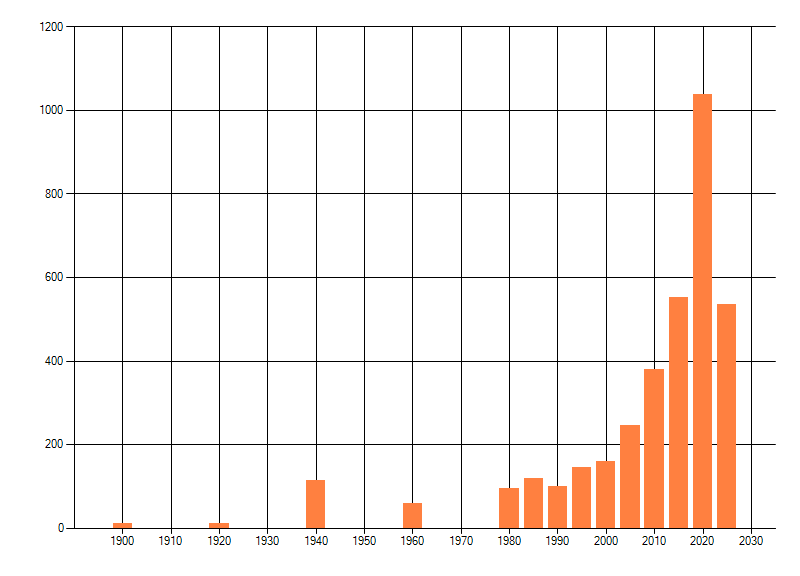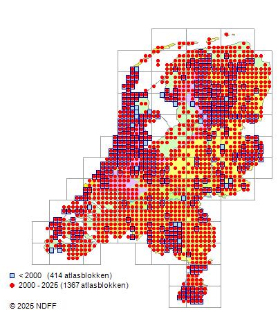 Het aantal atlasblokken (5x5 km) waarin de soort is gemeld binnen een periode van vijf jaar (vanaf 1980) of twintig jaar. Niet gecorrigeerd voor waarnemersinspanning en het aantal doorgegeven waarnemingen kan sterk variëren per periode, dus een trend in verspreiding kan hier niet direct uit worden afgelezen. Het opgegeven jaartal is het eerste jaar van de periode. Bron: gevalideerde waarnemingen uit de NDFF.