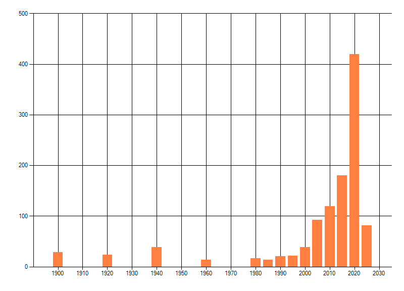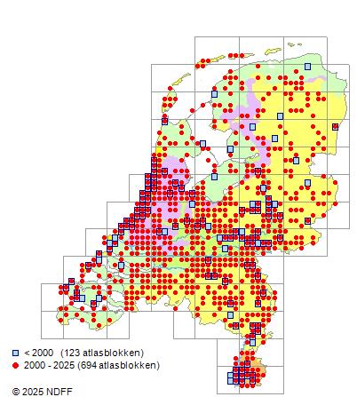 Het aantal atlasblokken (5x5 km) waarin de soort is gemeld binnen een periode van vijf jaar (vanaf 1980) of twintig jaar. Niet gecorrigeerd voor waarnemersinspanning en het aantal doorgegeven waarnemingen kan sterk variëren per periode, dus een trend in verspreiding kan hier niet direct uit worden afgelezen. Het opgegeven jaartal is het eerste jaar van de periode. Bron: gevalideerde waarnemingen uit de NDFF.