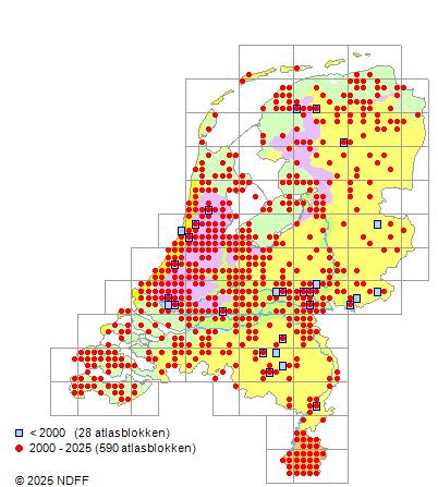Het aantal atlasblokken (5x5 km) waarin de soort is gemeld binnen een periode van vijf jaar (vanaf 1980) of twintig jaar. Niet gecorrigeerd voor waarnemersinspanning en het aantal doorgegeven waarnemingen kan sterk variëren per periode, dus een trend in verspreiding kan hier niet direct uit worden afgelezen. Het opgegeven jaartal is het eerste jaar van de periode. Bron: gevalideerde waarnemingen uit de NDFF.