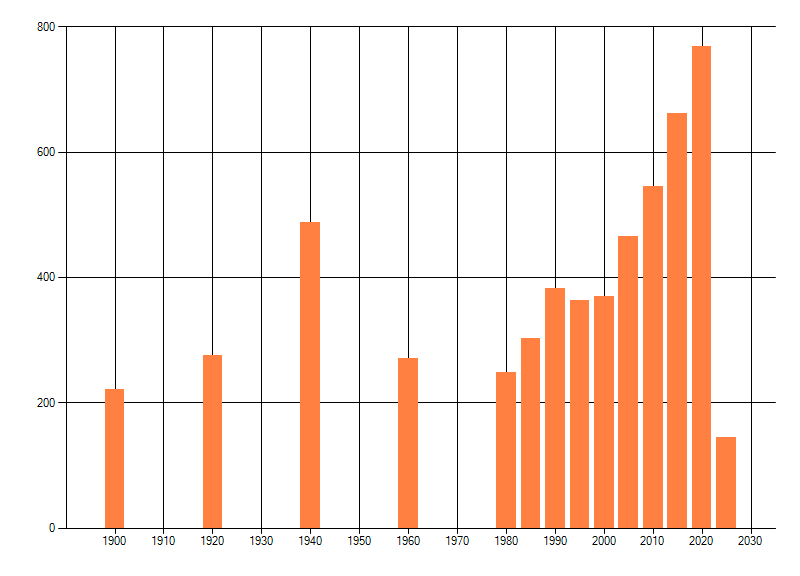 Het aantal atlasblokken (5x5 km) waarin de soort is gemeld binnen een periode van vijf jaar (vanaf 1980) of twintig jaar. Niet gecorrigeerd voor waarnemersinspanning en het aantal doorgegeven waarnemingen kan sterk variƫren per periode, dus een trend in verspreiding kan hier niet direct uit worden afgelezen. Het opgegeven jaartal is het eerste jaar van de periode. Bron: gevalideerde waarnemingen uit de NDFF.