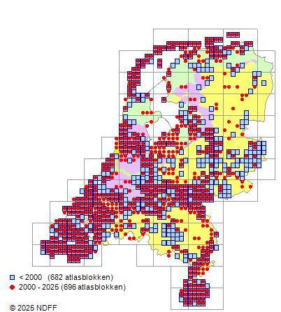 Het aantal atlasblokken (5x5 km) waarin de soort is gemeld binnen een periode van vijf jaar (vanaf 1980) of twintig jaar. Niet gecorrigeerd voor waarnemersinspanning en het aantal doorgegeven waarnemingen kan sterk variëren per periode, dus een trend in verspreiding kan hier niet direct uit worden afgelezen. Het opgegeven jaartal is het eerste jaar van de periode. Bron: gevalideerde waarnemingen uit de NDFF.