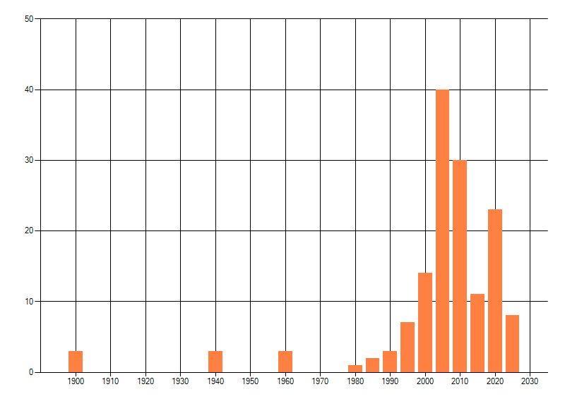 Het aantal atlasblokken (5x5 km) waarin de soort is gemeld binnen een periode van vijf jaar (vanaf 1980) of twintig jaar. Niet gecorrigeerd voor waarnemersinspanning en het aantal doorgegeven waarnemingen kan sterk variëren per periode, dus een trend in verspreiding kan hier niet direct uit worden afgelezen. Het opgegeven jaartal is het eerste jaar van de periode. Bron: gevalideerde waarnemingen uit de NDFF.