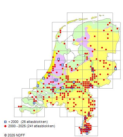 Het aantal atlasblokken (5x5 km) waarin de soort is gemeld binnen een periode van vijf jaar (vanaf 1980) of twintig jaar. Niet gecorrigeerd voor waarnemersinspanning en het aantal doorgegeven waarnemingen kan sterk variëren per periode, dus een trend in verspreiding kan hier niet direct uit worden afgelezen. Het opgegeven jaartal is het eerste jaar van de periode. Bron: gevalideerde waarnemingen uit de NDFF.