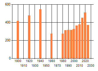 Het aantal atlasblokken (5x5 km) waarin de soort is gemeld binnen een periode van vijf jaar (vanaf 1980) of twintig jaar. Niet gecorrigeerd voor waarnemersinspanning en het aantal doorgegeven waarnemingen kan sterk variëren per periode, dus een trend in verspreiding kan hier niet direct uit worden afgelezen. Het opgegeven jaartal is het eerste jaar van de periode. Bron: gevalideerde waarnemingen uit de NDFF.