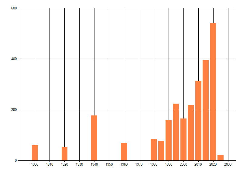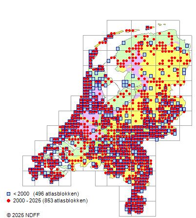 Het aantal atlasblokken (5x5 km) waarin de soort is gemeld binnen een periode van vijf jaar (vanaf 1980) of twintig jaar. Niet gecorrigeerd voor waarnemersinspanning en het aantal doorgegeven waarnemingen kan sterk variƫren per periode, dus een trend in verspreiding kan hier niet direct uit worden afgelezen. Het opgegeven jaartal is het eerste jaar van de periode. Bron: gevalideerde waarnemingen uit de NDFF.