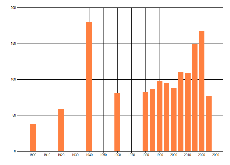 Het aantal atlasblokken (5x5 km) waarin de soort is gemeld binnen een periode van vijf jaar (vanaf 1980) of twintig jaar. Niet gecorrigeerd voor waarnemersinspanning en het aantal doorgegeven waarnemingen kan sterk variƫren per periode, dus een trend in verspreiding kan hier niet direct uit worden afgelezen. Het opgegeven jaartal is het eerste jaar van de periode. Bron: gevalideerde waarnemingen uit de NDFF.