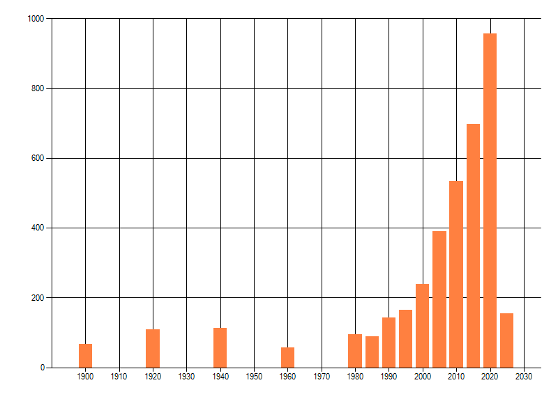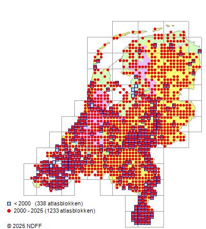 Het aantal atlasblokken (5x5 km) waarin de soort is gemeld binnen een periode van vijf jaar (vanaf 1980) of twintig jaar. Niet gecorrigeerd voor waarnemersinspanning en het aantal doorgegeven waarnemingen kan sterk variëren per periode, dus een trend in verspreiding kan hier niet direct uit worden afgelezen. Het opgegeven jaartal is het eerste jaar van de periode. Bron: gevalideerde waarnemingen uit de NDFF.