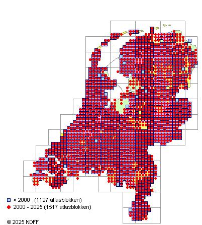 Het aantal atlasblokken (5x5 km) waarin de soort is gemeld binnen een periode van vijf jaar (vanaf 1980) of twintig jaar. Niet gecorrigeerd voor waarnemersinspanning en het aantal doorgegeven waarnemingen kan sterk variëren per periode, dus een trend in verspreiding kan hier niet direct uit worden afgelezen. Het opgegeven jaartal is het eerste jaar van de periode. Bron: gevalideerde waarnemingen uit de NDFF.