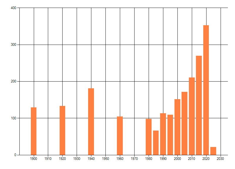 Het aantal atlasblokken (5x5 km) waarin de soort is gemeld binnen een periode van vijf jaar (vanaf 1980) of twintig jaar. Niet gecorrigeerd voor waarnemersinspanning en het aantal doorgegeven waarnemingen kan sterk variëren per periode, dus een trend in verspreiding kan hier niet direct uit worden afgelezen. Het opgegeven jaartal is het eerste jaar van de periode. Bron: gevalideerde waarnemingen uit de NDFF.