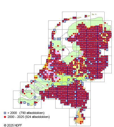 Het aantal atlasblokken (5x5 km) waarin de soort is gemeld binnen een periode van vijf jaar (vanaf 1980) of twintig jaar. Niet gecorrigeerd voor waarnemersinspanning en het aantal doorgegeven waarnemingen kan sterk variƫren per periode, dus een trend in verspreiding kan hier niet direct uit worden afgelezen. Het opgegeven jaartal is het eerste jaar van de periode. Bron: gevalideerde waarnemingen uit de NDFF.
