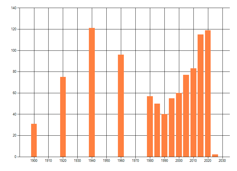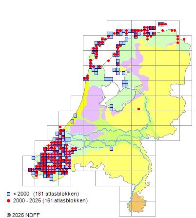 Het aantal atlasblokken (5x5 km) waarin de soort is gemeld binnen een periode van vijf jaar (vanaf 1980) of twintig jaar. Niet gecorrigeerd voor waarnemersinspanning en het aantal doorgegeven waarnemingen kan sterk variëren per periode, dus een trend in verspreiding kan hier niet direct uit worden afgelezen. Het opgegeven jaartal is het eerste jaar van de periode. Bron: gevalideerde waarnemingen uit de NDFF.
