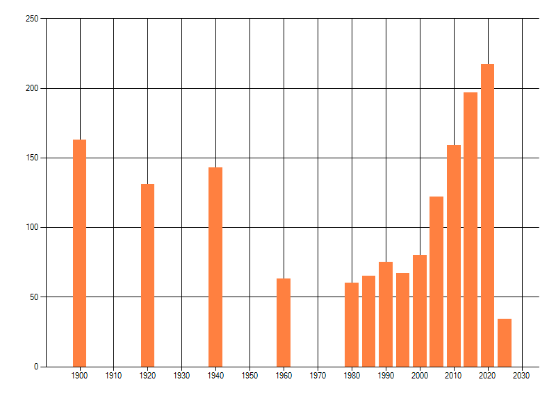 Het aantal atlasblokken (5x5 km) waarin de soort is gemeld binnen een periode van vijf jaar (vanaf 1980) of twintig jaar. Niet gecorrigeerd voor waarnemersinspanning en het aantal doorgegeven waarnemingen kan sterk variëren per periode, dus een trend in verspreiding kan hier niet direct uit worden afgelezen. Het opgegeven jaartal is het eerste jaar van de periode. Bron: gevalideerde waarnemingen uit de NDFF.