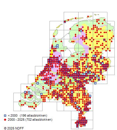 Het aantal atlasblokken (5x5 km) waarin de soort is gemeld binnen een periode van vijf jaar (vanaf 1980) of twintig jaar. Niet gecorrigeerd voor waarnemersinspanning en het aantal doorgegeven waarnemingen kan sterk variëren per periode, dus een trend in verspreiding kan hier niet direct uit worden afgelezen. Het opgegeven jaartal is het eerste jaar van de periode. Bron: gevalideerde waarnemingen uit de NDFF.