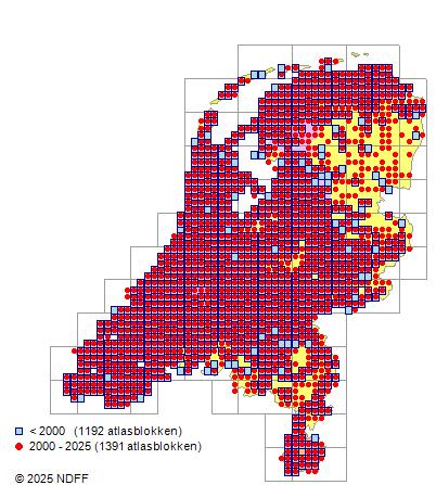 Het aantal atlasblokken (5x5 km) waarin de soort is gemeld binnen een periode van vijf jaar (vanaf 1980) of twintig jaar. Niet gecorrigeerd voor waarnemersinspanning en het aantal doorgegeven waarnemingen kan sterk variëren per periode, dus een trend in verspreiding kan hier niet direct uit worden afgelezen. Het opgegeven jaartal is het eerste jaar van de periode. Bron: gevalideerde waarnemingen uit de NDFF.