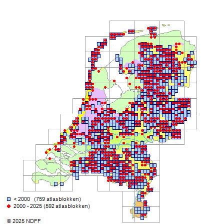 Het aantal atlasblokken (5x5 km) waarin de soort is gemeld binnen een periode van vijf jaar (vanaf 1980) of twintig jaar. Niet gecorrigeerd voor waarnemersinspanning en het aantal doorgegeven waarnemingen kan sterk variƫren per periode, dus een trend in verspreiding kan hier niet direct uit worden afgelezen. Het opgegeven jaartal is het eerste jaar van de periode. Bron: gevalideerde waarnemingen uit de NDFF.