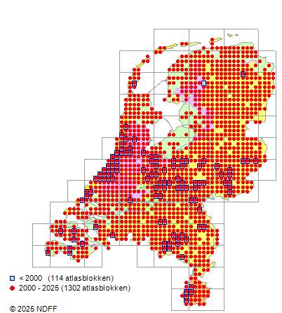Het aantal atlasblokken (5x5 km) waarin de soort is gemeld binnen een periode van vijf jaar (vanaf 1980) of twintig jaar. Niet gecorrigeerd voor waarnemersinspanning en het aantal doorgegeven waarnemingen kan sterk variëren per periode, dus een trend in verspreiding kan hier niet direct uit worden afgelezen. Het opgegeven jaartal is het eerste jaar van de periode. Bron: gevalideerde waarnemingen uit de NDFF.