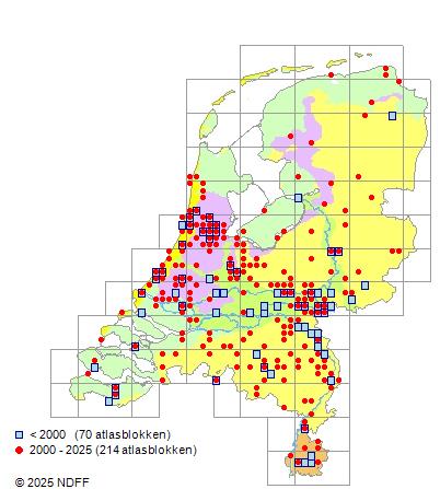 Het aantal atlasblokken (5x5 km) waarin de soort is gemeld binnen een periode van vijf jaar (vanaf 1980) of twintig jaar. Niet gecorrigeerd voor waarnemersinspanning en het aantal doorgegeven waarnemingen kan sterk variƫren per periode, dus een trend in verspreiding kan hier niet direct uit worden afgelezen. Het opgegeven jaartal is het eerste jaar van de periode. Bron: gevalideerde waarnemingen uit de NDFF.