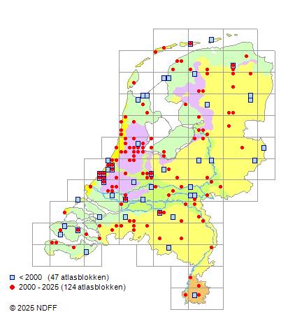 Het aantal atlasblokken (5x5 km) waarin de soort is gemeld binnen een periode van vijf jaar (vanaf 1980) of twintig jaar. Niet gecorrigeerd voor waarnemersinspanning en het aantal doorgegeven waarnemingen kan sterk variëren per periode, dus een trend in verspreiding kan hier niet direct uit worden afgelezen. Het opgegeven jaartal is het eerste jaar van de periode. Bron: gevalideerde waarnemingen uit de NDFF.