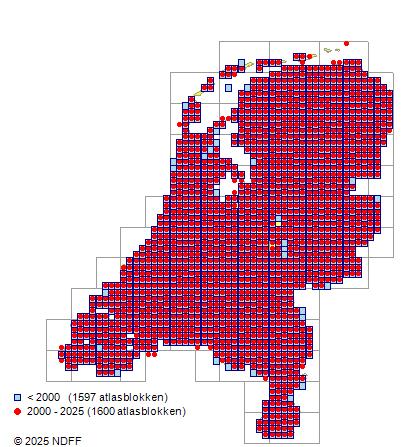 Het aantal atlasblokken (5x5 km) waarin de soort is gemeld binnen een periode van vijf jaar (vanaf 1980) of twintig jaar. Niet gecorrigeerd voor waarnemersinspanning en het aantal doorgegeven waarnemingen kan sterk variƫren per periode, dus een trend in verspreiding kan hier niet direct uit worden afgelezen. Het opgegeven jaartal is het eerste jaar van de periode. Bron: gevalideerde waarnemingen uit de NDFF.