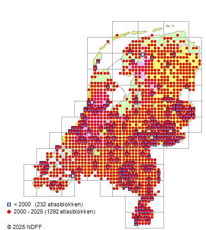 Het aantal atlasblokken (5x5 km) waarin de soort is gemeld binnen een periode van vijf jaar (vanaf 1980) of twintig jaar. Niet gecorrigeerd voor waarnemersinspanning en het aantal doorgegeven waarnemingen kan sterk variƫren per periode, dus een trend in verspreiding kan hier niet direct uit worden afgelezen. Het opgegeven jaartal is het eerste jaar van de periode. Bron: gevalideerde waarnemingen uit de NDFF.