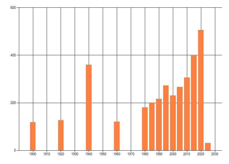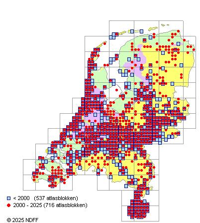 Het aantal atlasblokken (5x5 km) waarin de soort is gemeld binnen een periode van vijf jaar (vanaf 1980) of twintig jaar. Niet gecorrigeerd voor waarnemersinspanning en het aantal doorgegeven waarnemingen kan sterk variëren per periode, dus een trend in verspreiding kan hier niet direct uit worden afgelezen. Het opgegeven jaartal is het eerste jaar van de periode. Bron: gevalideerde waarnemingen uit de NDFF.