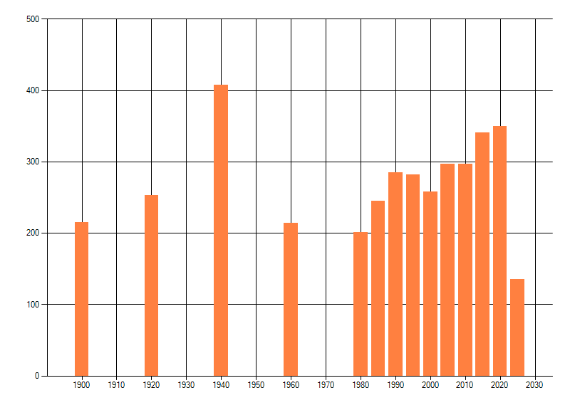 Het aantal atlasblokken (5x5 km) waarin de soort is gemeld binnen een periode van vijf jaar (vanaf 1980) of twintig jaar. Niet gecorrigeerd voor waarnemersinspanning en het aantal doorgegeven waarnemingen kan sterk variƫren per periode, dus een trend in verspreiding kan hier niet direct uit worden afgelezen. Het opgegeven jaartal is het eerste jaar van de periode. Bron: gevalideerde waarnemingen uit de NDFF.