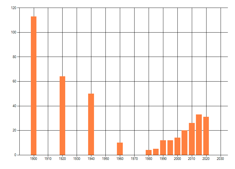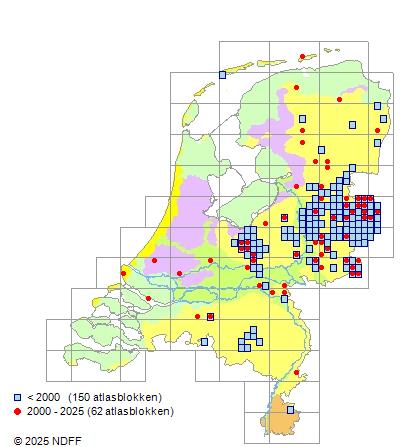 Het aantal atlasblokken (5x5 km) waarin de soort is gemeld binnen een periode van vijf jaar (vanaf 1980) of twintig jaar. Niet gecorrigeerd voor waarnemersinspanning en het aantal doorgegeven waarnemingen kan sterk variëren per periode, dus een trend in verspreiding kan hier niet direct uit worden afgelezen. Het opgegeven jaartal is het eerste jaar van de periode. Bron: gevalideerde waarnemingen uit de NDFF.