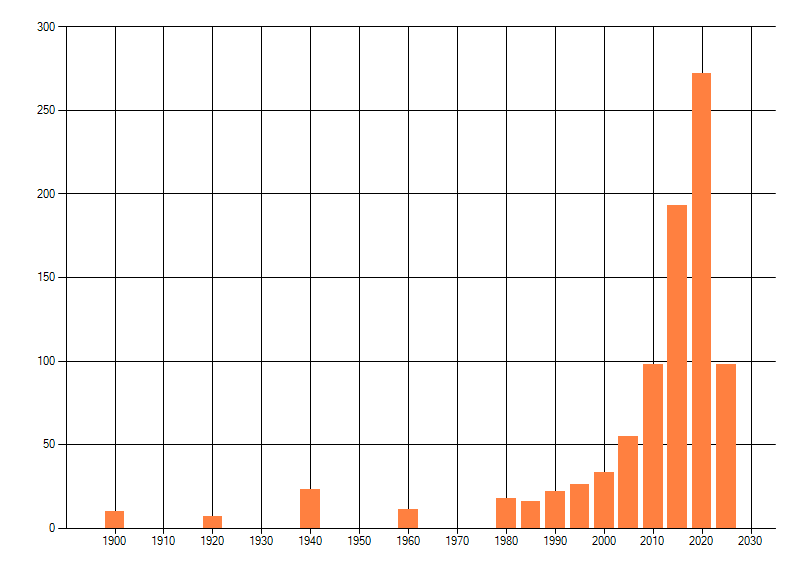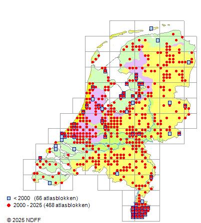 Het aantal atlasblokken (5x5 km) waarin de soort is gemeld binnen een periode van vijf jaar (vanaf 1980) of twintig jaar. Niet gecorrigeerd voor waarnemersinspanning en het aantal doorgegeven waarnemingen kan sterk variëren per periode, dus een trend in verspreiding kan hier niet direct uit worden afgelezen. Het opgegeven jaartal is het eerste jaar van de periode. Bron: gevalideerde waarnemingen uit de NDFF.