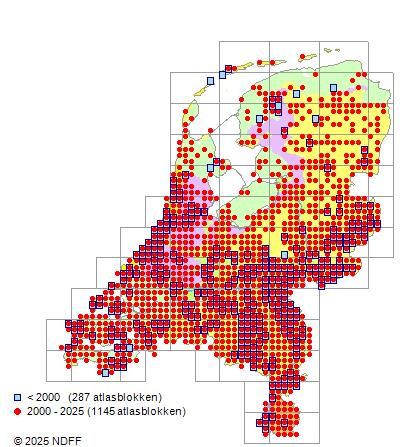 Het aantal atlasblokken (5x5 km) waarin de soort is gemeld binnen een periode van vijf jaar (vanaf 1980) of twintig jaar. Niet gecorrigeerd voor waarnemersinspanning en het aantal doorgegeven waarnemingen kan sterk variëren per periode, dus een trend in verspreiding kan hier niet direct uit worden afgelezen. Het opgegeven jaartal is het eerste jaar van de periode. Bron: gevalideerde waarnemingen uit de NDFF.
