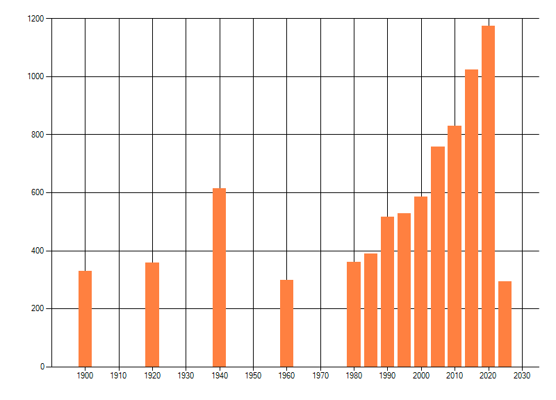 Het aantal atlasblokken (5x5 km) waarin de soort is gemeld binnen een periode van vijf jaar (vanaf 1980) of twintig jaar. Niet gecorrigeerd voor waarnemersinspanning en het aantal doorgegeven waarnemingen kan sterk variëren per periode, dus een trend in verspreiding kan hier niet direct uit worden afgelezen. Het opgegeven jaartal is het eerste jaar van de periode. Bron: gevalideerde waarnemingen uit de NDFF.